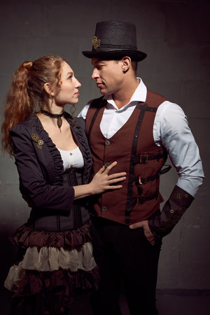 Loving couple in vintage outfits looking at each other against grey background