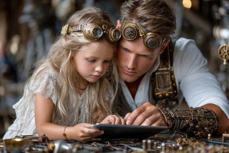 A father and daughter work together, inspecting gadgets on a tablet in a steampunk-themed workshop filled with gears.