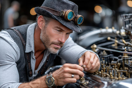 Skilled mechanic focuses intently on fine-tuning vintage machinery at an outdoor car show event.