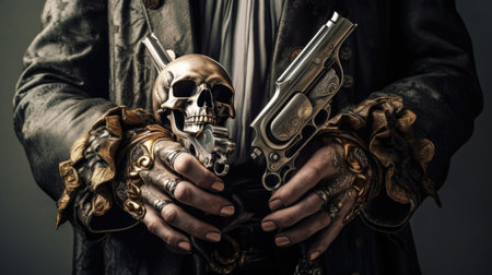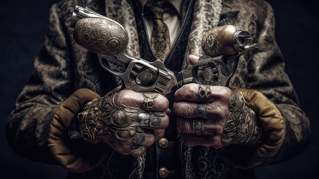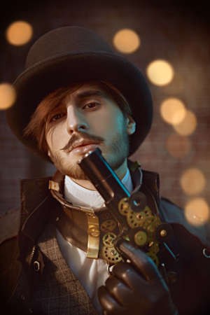 Steampunk world. Portrait of a courageous steampunk man in a coat and top hat holding a gun.