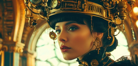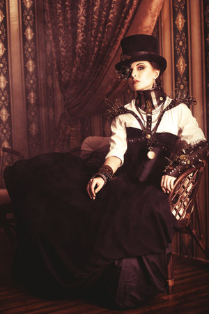 Portrait of a beautiful steampunk woman in a luxurious interior.