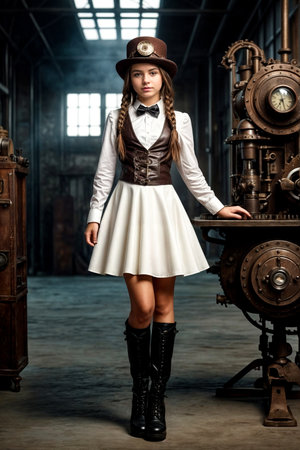 Portrait of stylish teen girl model 13 year old in steampunk image in retro white dress and leather top hat posing in machinery room. Teenage girl in retro style. Adventure concept. Copy ad text space