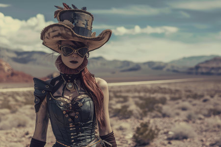Fashionable woman in steampunk attire posing in a rugged desert setting