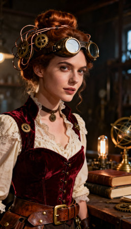 Steampunk woman wearing a red velvet corset, lace blouse, and mechanical goggles adorned with gears. She stands in a retro-futuristic workshop with books, a globe, and warm lighting.