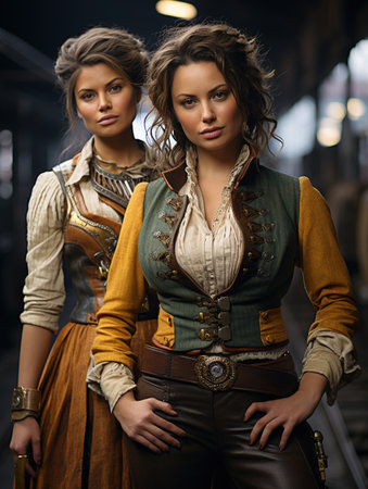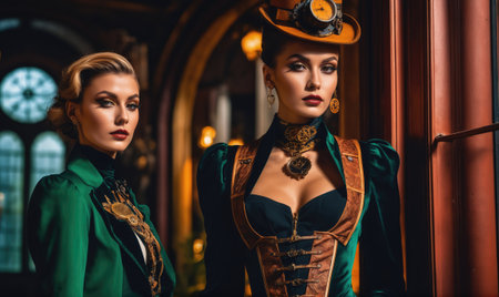 Two women in steampunk attire stand in an opulent room, looking regal and mysterious