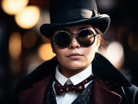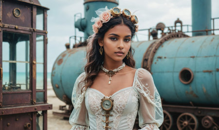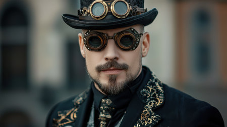 Steampunk cosplayer wearing goggles and a top hat confidently posing near a steam train, blending victorian aesthetics with futuristic elements in an elaborate scene