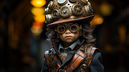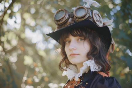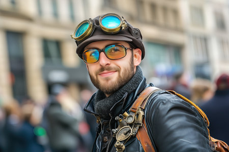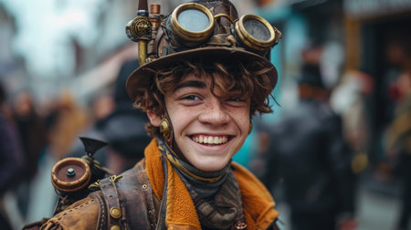 Realistic photo concept of a cheerful young adult post-apocalypse person in steampunk attire, smiling with a joyful expression Generative AI