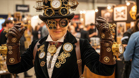 A person dressed in an elaborate steampunk costume stands confidently at an event. The costume includes a top hat adorned with multiple clocks and gears, goggles, and a waistcoat decorated with various mechanical elements. The individual also wears intricate gloves with built-in gears and holds their arms outstretched, showcasing the detailed craftsmanship of their attire. The background reveals a bustling event with other attendees and displays visible.