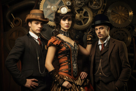A diverse group of individuals standing side by side, posing for a photograph, Steampunk inspired outfits in a vintage clockwork setting, AI Generated