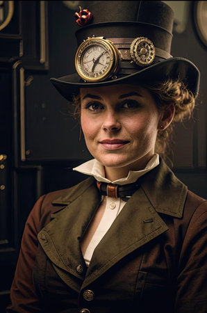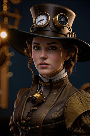 A woman wearing a steampunk-inspired outfit with goggles, a top hat, and a leather vest stands in front of a background of intricate clockwork gears.