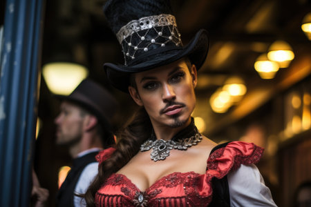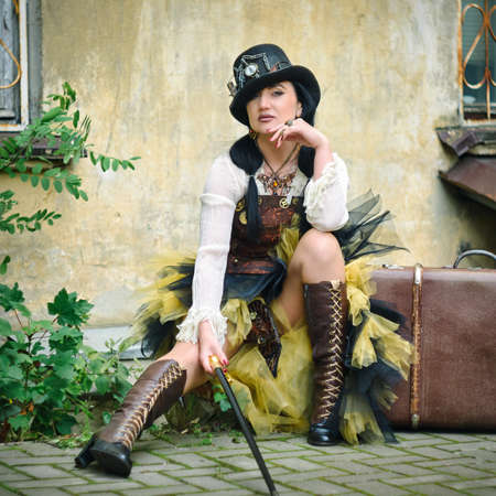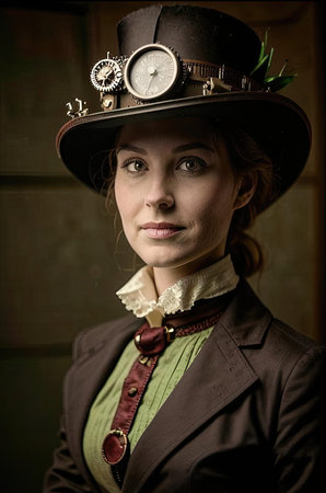 portrait of beautiful steampunk woman wearing vintage hat and corset posing next to color background