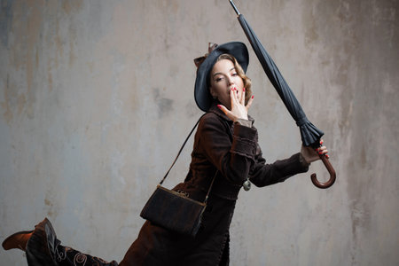 A stylish lady in an elegant Victorian-style suit, wearing a hat with an umbrella in her hands