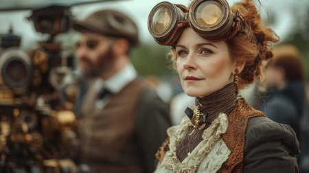 A woman dressed in intricate steampunk fashion with goggles enjoys a vibrant outdoor gathering. The event is filled with people dressed in vintage styles, showcasing creativity and craftsmanship.