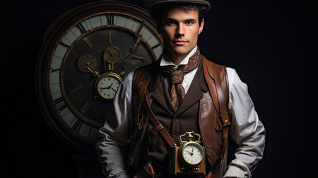 Steampunk fashion: male holding intricate brass gear in gloved hand.