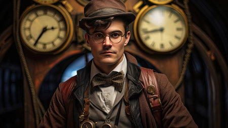 Scientist steampunk man inventor works in his laboratory with Victorian interior. Adventure world of steampunk.