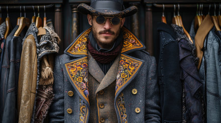 portrait of a male cowboy in an extravangarde suit, in a fitting room