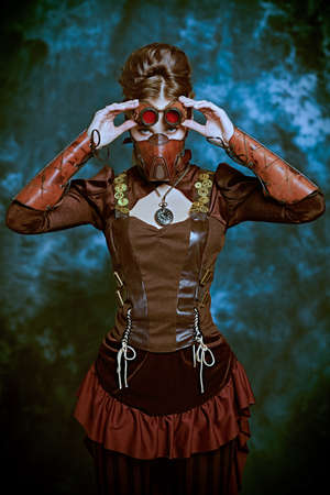 Portrait of a beautiful victorian steampunk lady in a mask on a grunge background. Fantasy world, scientific inventions.