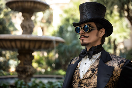 Stylish man with a mustache, dressed in steampunk attire, striking a pose near an elegant fountain in a vibrant garden setting
