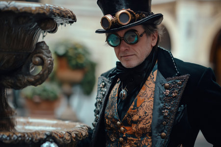 Elegant man wearing steampunk top hat and goggles posing near an ornate fountain, showcasing vintage fashion and retro futuristic style
