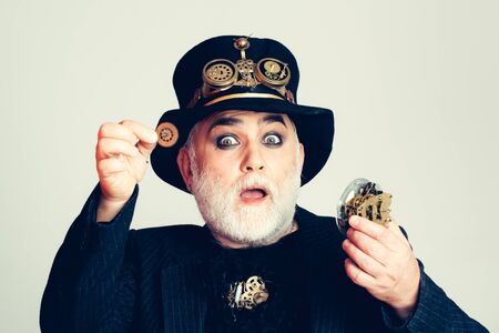 Amazed man senior bearded male or watchmaker with white beard in black hat keeps cogwheel and mechanical metallic gears on grey wall
