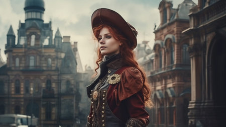Portrait of attractive redhead steampunk woman standing on old city street background. Steampunk and retro-futurism style.