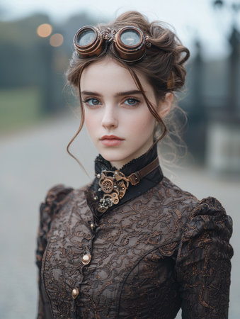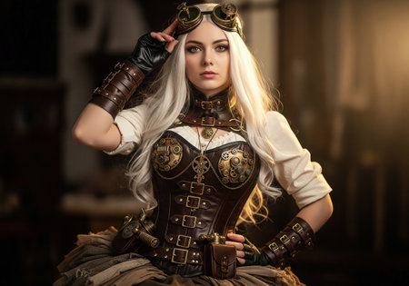 A portrait of a beautiful woman with white hair wearing an intricately steampunk costume with goggles