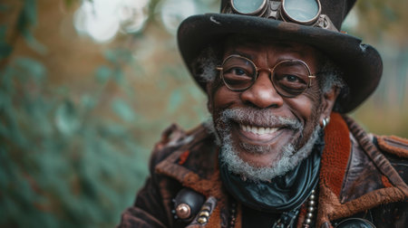 Photo concept of an older post-apocalypse individual in steampunk clothing, smiling warmly and portraying hopefulness Generative AI