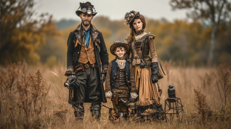 Photo concept of a family portrait in steampunk style post-apocalypse attire, displaying joy and resilience despite the environment Generative AI