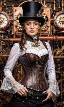 A steampunk siren in a corseted leather bodysuit and copper-colored stockings, posing dramatically amidst a backdrop of intricate clockwork machinery and vintage scientific instruments, with a hint of mystical, otherworldly energy