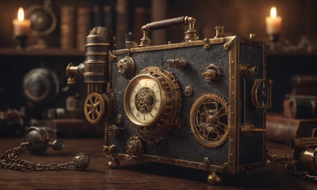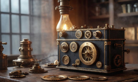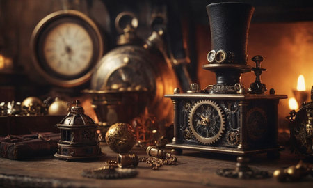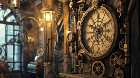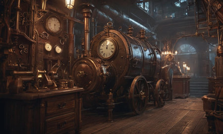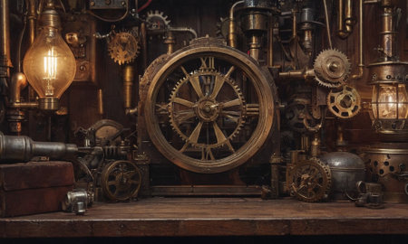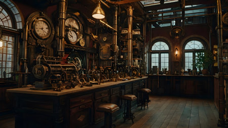 Steampunk Laboratory with Vintage Machinery and Clocks