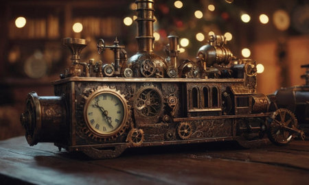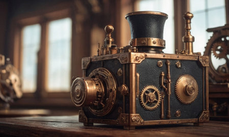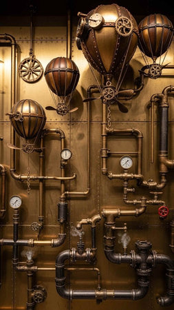 This captivating steampunk mechanism features intricate brass gears and tubes, highlighting the artistry and craftsmanship of vintage engineering in a workshop setting.