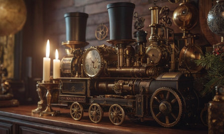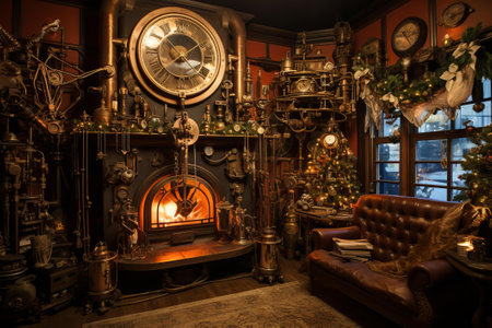 Warm and inviting steampunk-themed room decorated for Christmas with a lit fireplace and clock