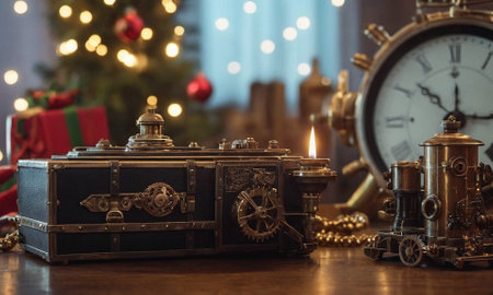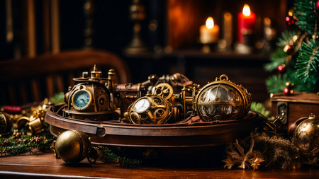 New Year in steampunk style. Mechanisms, gears and Christmas decorations. High quality illustration