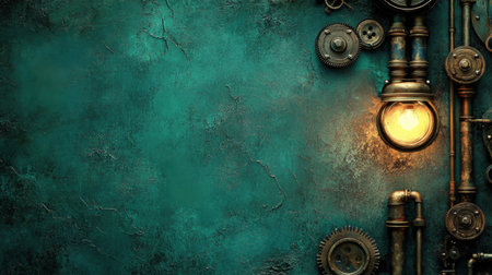 This image features a textured teal surface combined with antique gears and pipes, highlighted by a warm glowing light bulb, perfect for vintage-themed design projects.