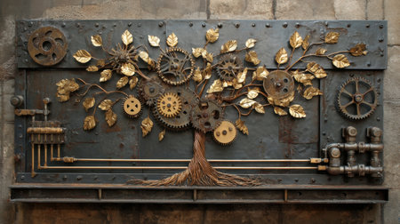 This striking metal sculpture features a tree design formed from intricate gears and pipes, blending industrial elements with an artistic interpretation of nature.