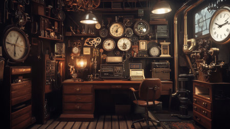 An image of a retro-futuristic steampunk office space filled with vintage clocks and various pieces of furniture.