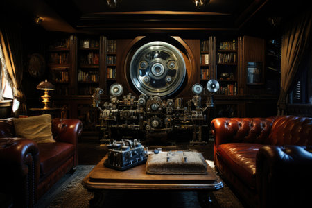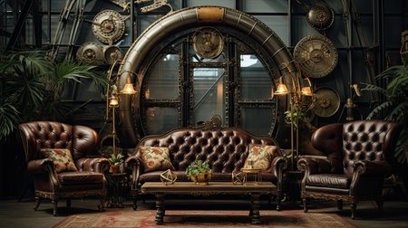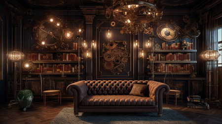 Luxurious steampunk living room with chesterfield sofa, bookshelves, gear wall art, and vintage lighting creates a sophisticated and unique atmosphere. Ai generative