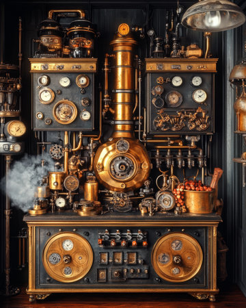 Elaborate brass and copper steampunk machinery with gauges, dials, and pipes emitting steam