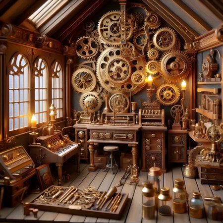 Intricate steampunk workshop featuring brass gears, steam engines, and unique inventions