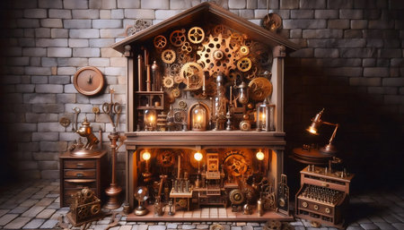 Copper and brass elements blend seamlessly in this steampunk style interior, filled with vintage decorations. Intricate clocks adorn walls while a wooden desk invites creativity in a unique workspace.