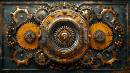Three-dimensional digital illustration of steampunk gears on a yellow Victorian background