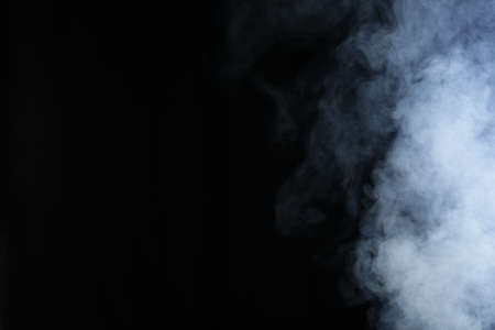 Curly white steam rising up and splashing water scattering in different directions isolated on a black background. Can be used as background, design element