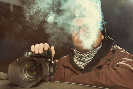 Photographer with camera and smoke on blurred background, artistic and creative photography concept