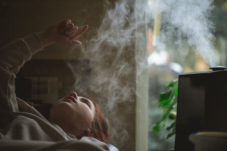 teen girl lying on a sofa, pointing at vapor from a humidifier, enjoying improved air quality and the benefits for her respiratory health in a cozy home