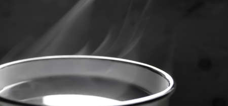 From a cup of coffee comes steam. Steam from a cup. Hot coffee. Black and white photo. Hot drink. Smoke from a cup.