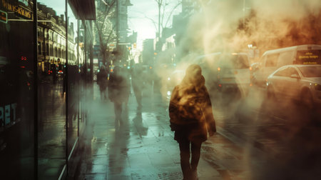 Steam rising from city streets after a heavy rainfall during extreme heat conditions depicting the urban heat and climate change challenges faced by metropolitan areas