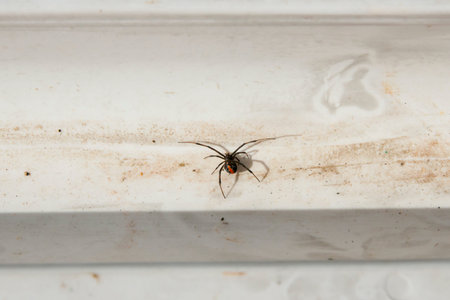 Closeup to a little black and dark orange garden spider over a screw at window frame.