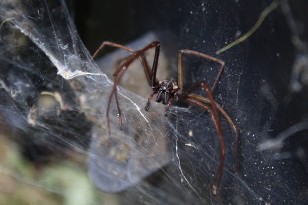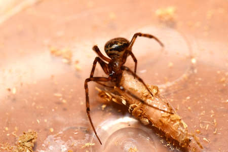 Small Brown Spitting Spider of the genus Scytodes in exchange for exoskeleton