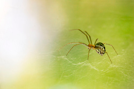 spider on a web in a forest on a green background. wildlife. colorful detailed macro photo of an insect. close-up. bokeh