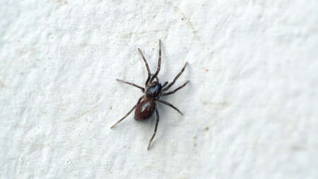 Macro image of a jumping spider, called Plexippus paykulli, on a white wall, Ruse, Bulgaria.